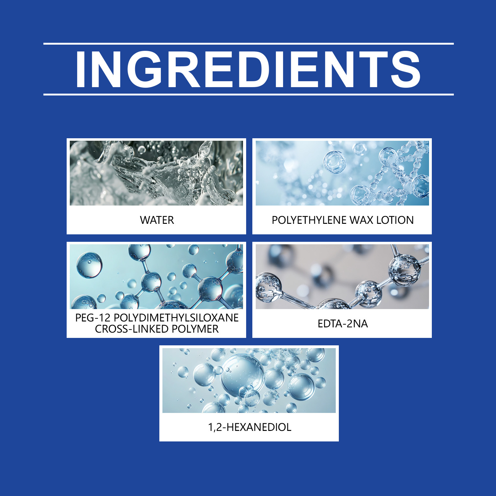 Ingredients: water, PEG-12 polydimethylsiloxane crosslinked polymer, polyethylene wax emulsion, 1,2- hexanediol, EDTA-2Na.